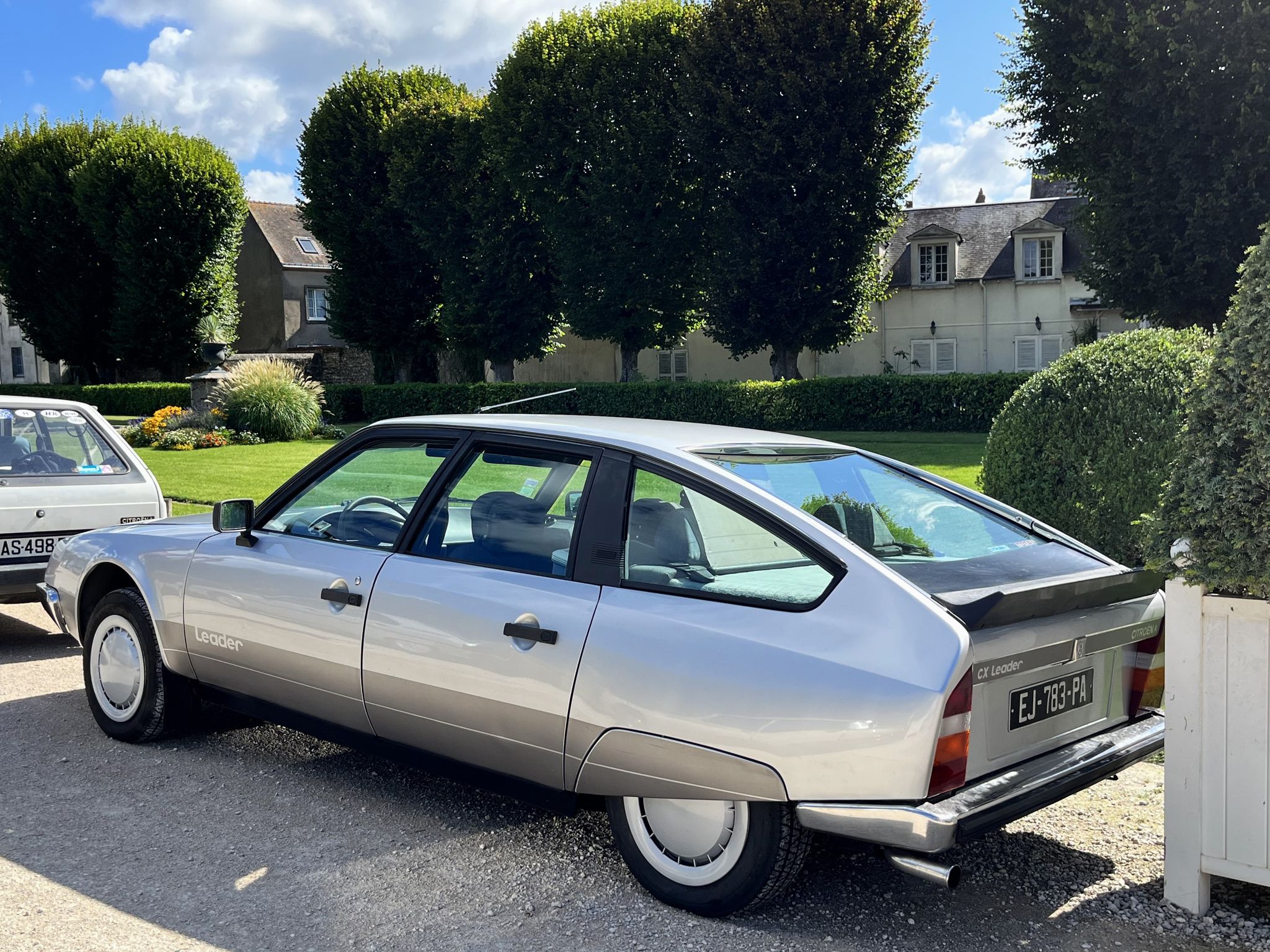 Cinquantenaire également, la CX n’est plus vraiment boudée. D’où un nombre réduit de participantes, dont une rare 25 RI avec option ABS. Coup de cœur pour la 2200 Super vert Iroise de 1976 avec sellerie cuir mais sans Diravi, avec laquelle nous avons gagné le rallye-découverte de la Sologne du samedi. Sortir les biscotos en manœuvre est une expérience très étrange pour un habitué à la Diravi ! Autre coup de cœur chez les CX, la 20 Leader série 1 de Thierry a la particularité rare de posséder encore ses couvre-jantes d’origine, taillés aux dimensions des roues spéciales pour pneus TRX, ce qui n’est pas le cas des enjoliveurs des Leader série 2, prévus pour des roues de 14 pouces. Au-delà du décor latéral biton, très à la mode dans les années 1980, le retrait des baguettes de protection latérales, caractéristique des premières Leader, permet de retrouver un peu de la pureté de la CX originelle.