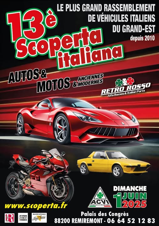 champ de mars 88200 remiremont 22 bis rue, d'armont, 88200 remiremontConcentration de voitures et motos italiennes de collection et de prestige le dimanche 1 juin 2025 de 10h00 a 18h00 sur le champ de mars de Remiremont 88200 venez nombreux