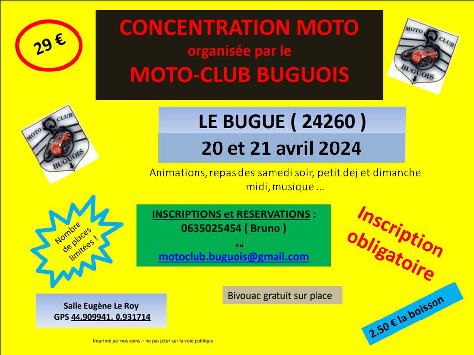 L’équipe du MOTO CLUB BUGUOIS vous propose sa concentration annuelle les 20 et 21 AVRIL 2024 à la salle Eugène Le Roy au BUGUE ( 24260 ).