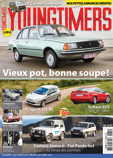 En mal de GT au long cours ? Alors nous vous proposons une ballade en Subaru SVX, l’un des coupés les plus atypiques de ces 20 dernières années. Si vous vous êtes fait tatouer le logo de Volkswagen sur l’avant-bras, vous adorerez sans doute notre rencontre avec un Transporter T3 revu et corrigé par Oettinger. Enfin, nous refaisons le match entre deux petits 4X4 qui ont défrayé la chronique dans les années 80 et 90 : le Suzuki Samuraï et la Fiat Panda 4X4. Et bien sûr comme chaque mois, notre rubrique instantanée, notre revue de doc et le billet de l’oncle Pat’. Et n’oubliez pas de nous rendre visite à Rétromobile !