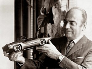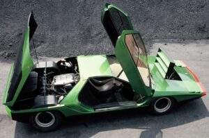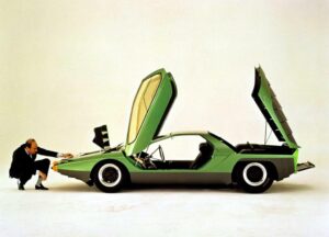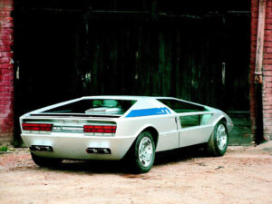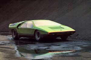 1968. En ces temps d’abondances où les courbes de croissance semblent ne jamais faiblir, la conquête spatiale nourrit une foi béate dans la technologie. L’informatique balbutiante promet un futur écrit en caractères digitaux quand la musique s’électronise au son des premiers synthétiseurs. Lors des salons de l’automobile, des engins expérimentaux laissent imaginer une voiture de l’an 2000 en forme de capsule spatiale. L’époque n’est pas à la nostalgie. Les coulures de chrome et ventre mou ont vécu. Même chez les grands maîtres de l’élégance italienne, d’ordinaire habitués à dessiner leurs voitures comme des femmes allongées, les lignes ne cessent de se tendre.