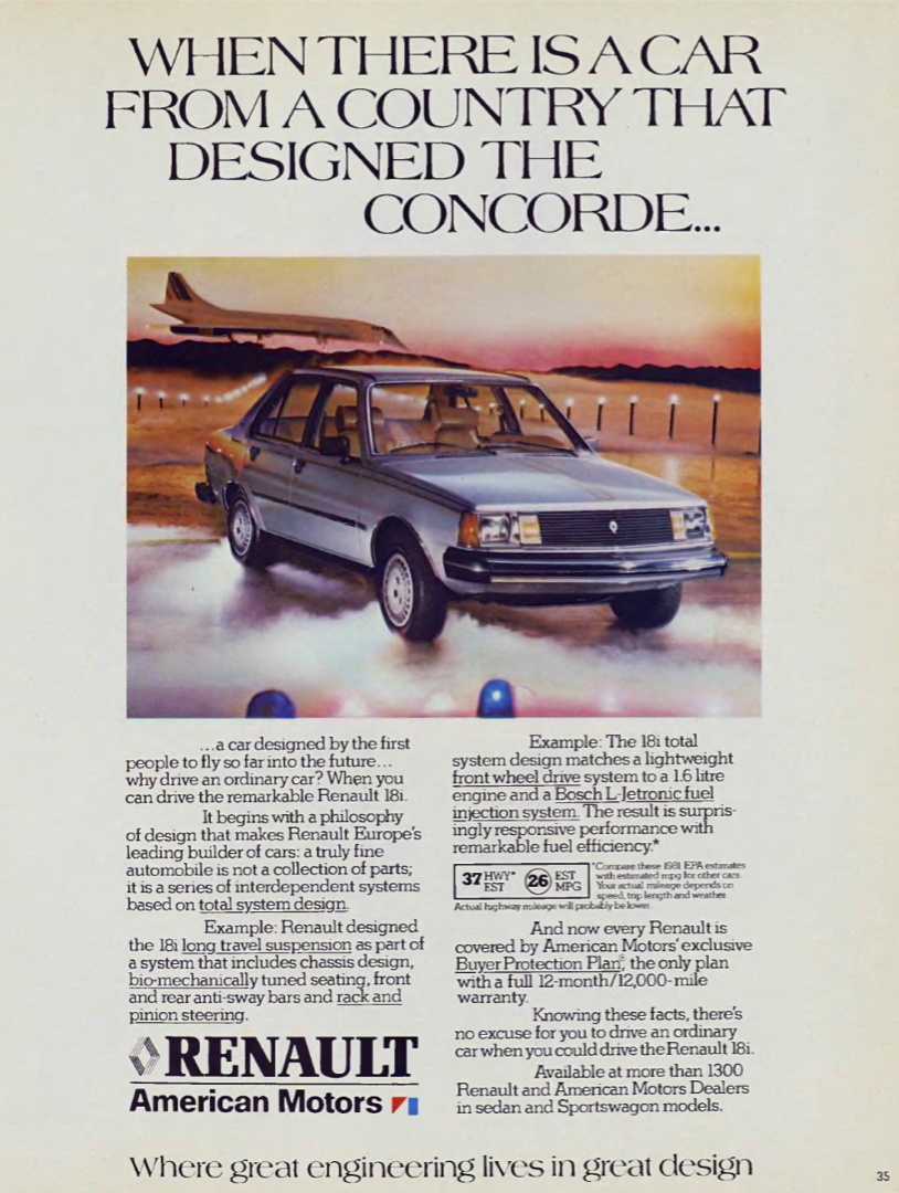 Le nom de Renault n’a pas pas laissé un grand souvenir aux États-Unis. On citera notamment les déconvenues de la Dauphine, infiniment moins vendue sur place qu’une Volkswagen pas forcément meilleure techniquement. Le Concorde représente donc un formidable accélérateur de notoriété. Mais de là à lui associer un modèle aussi conventionnel que la R18, n’est-ce pas un peu capillotracté ?
