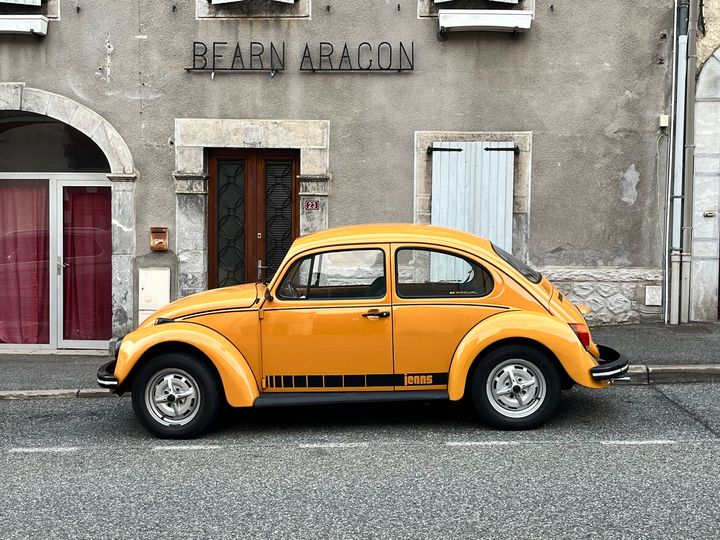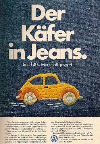 D’abord peinte en jaune Tunis, la Jeans camoufle ses éléments chromés (jugés alors rétrogrades) par de la peinture noire assortie à ses bandes adhésives et chausse des jantes Lemmerz d’allure sportive. Ses sièges revêtent logiquement du blue jean (avec des passepoils bleus et des surpiqûres jaunes) assorti au vinyle des contre-portes. Fin 1973, une seconde série se reconnaît à ses jantes Lemmerz Champion ou Marathon et aux choix des teintes rouge Phoenix, jaune Marino et jaune Brillant. A chacune correspond une couleur de jean différente : noir, bleu ou vert. Suit une troisième série en octobre 1974. Retour aux jantes GT et modifications des modèles 75 : clignotants sur pare-choc et non plus au sommet des ailes, protection plastique sur planche de bord, appuis-tête. Teintes orange Nepal, orange Leucht et jaune Tunis. L’élixir de jeunesse a si bien fonctionné que VW commercialisa à la mi-74 un kit de transformation de toute Coccinelle en Jeans !