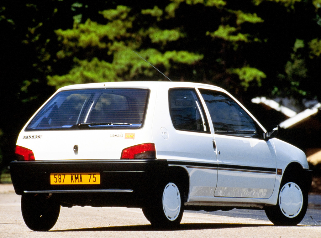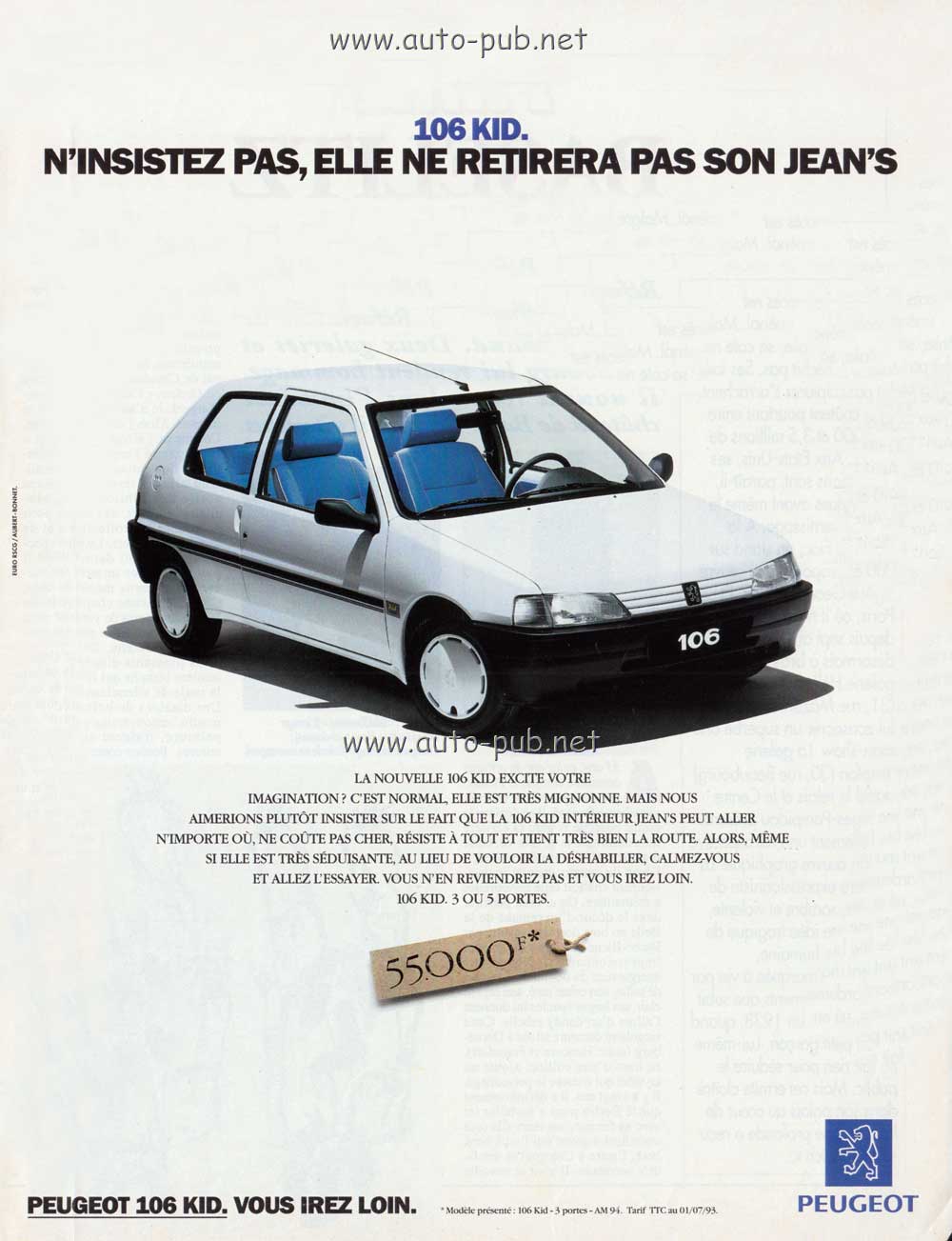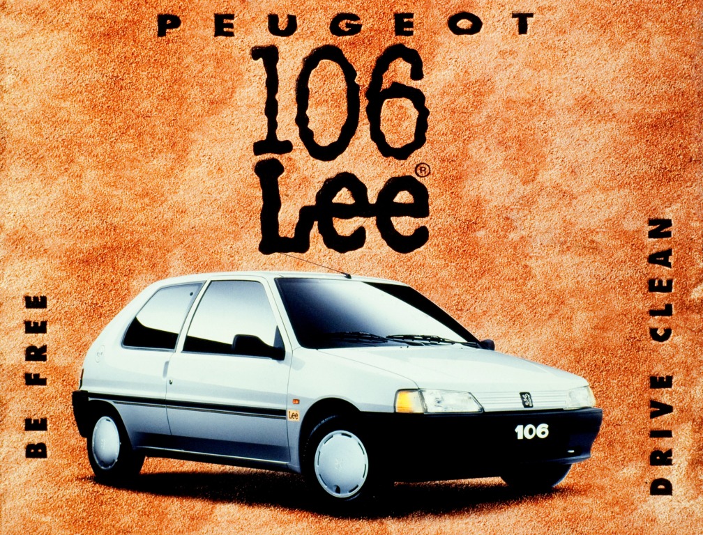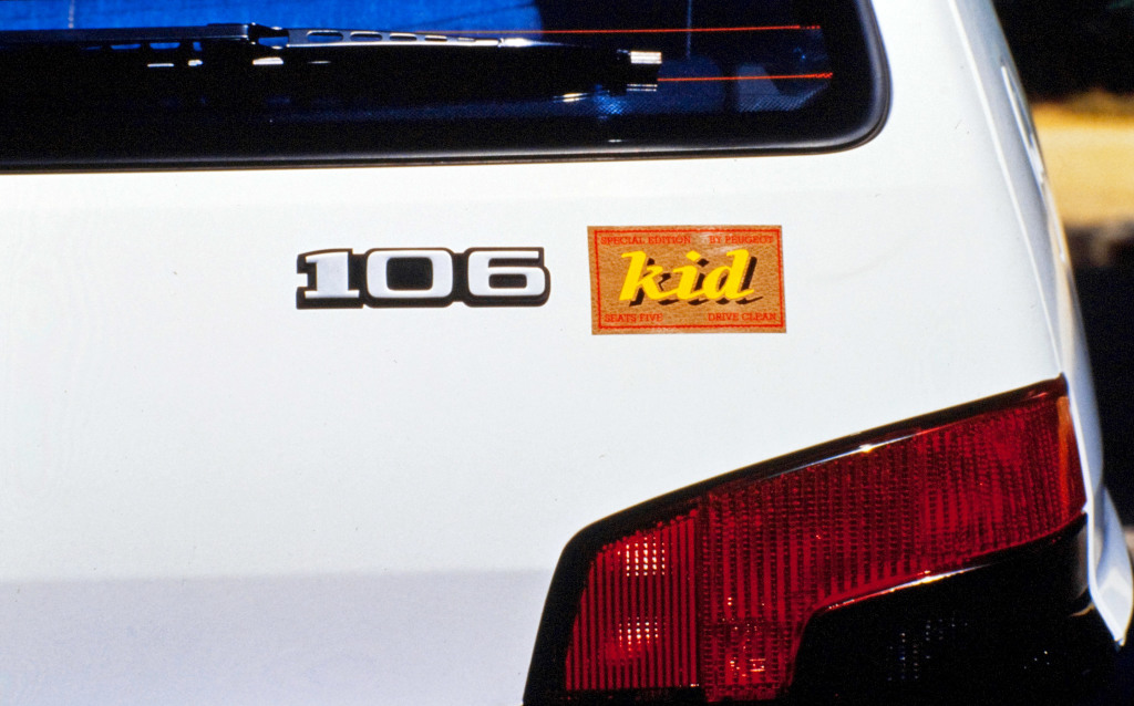 Un an plus tard, à la rentrée 1993, la 106 Kid (gamin ou jeune, en anglais) reprend l’intégralité du concept 205 Junior. Elle est commercialisée en Italie sous la marque de jeans Lee dans le cadre d’un accord de cobranding. Levi’s ou Lee Cooper ont-ils été approchés ? Les 954 cm³ du petit moteur essence sont toujours là, les enjoliveurs Profil aussi, mais des baguettes de protection ceinturent enfin la caisse, le jean a droit à des passepoils jaunes et les fonds des compteurs s’assortissent à la sellerie. Le logo bavard indique « Kid / Special edition by Peugeot / Seats five / Drive clean ». Il singe l’étiquette d’un jean sur les contre-porte et le volet arrière. Nouveauté : le noir Onyx rejoint l’emblématique blanc Meije et le rouge Vallelunga. Dans un second temps, le client pourra choisir un jean vert pour les sièges et les compteurs en fonction de la couleur de la caisse. Essence ou diésel, la Kid va perdurer dans la gamme 106 jusqu’au printemps 1998 où la plus ordinaire Open prend le relai.