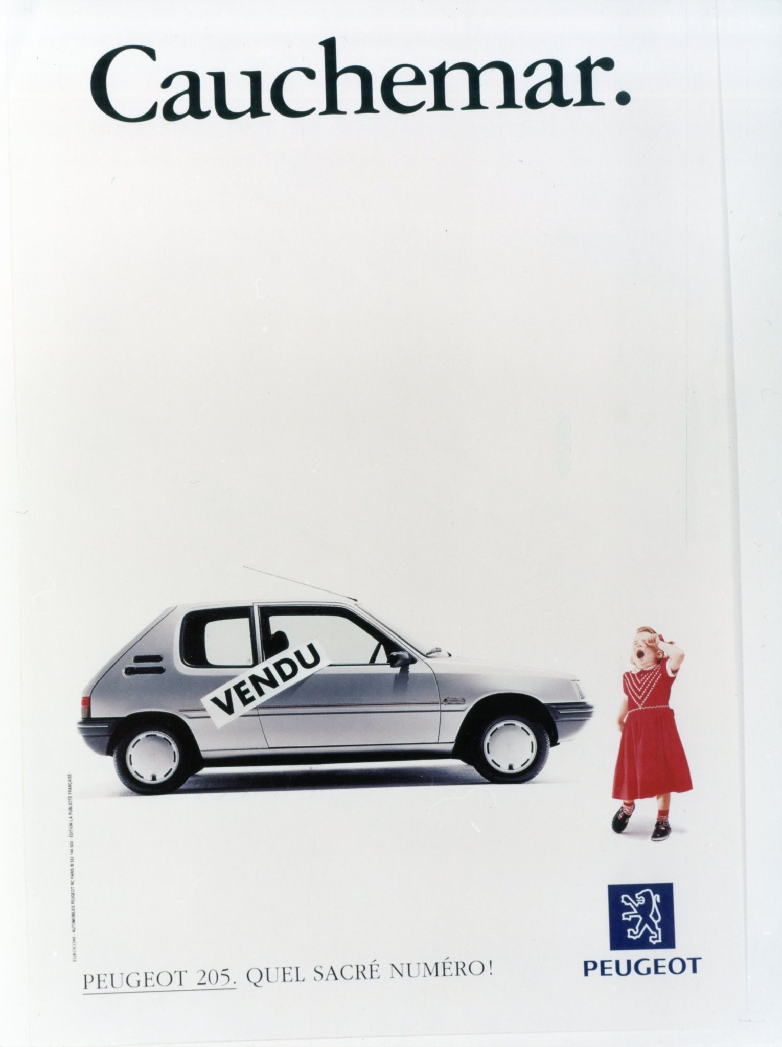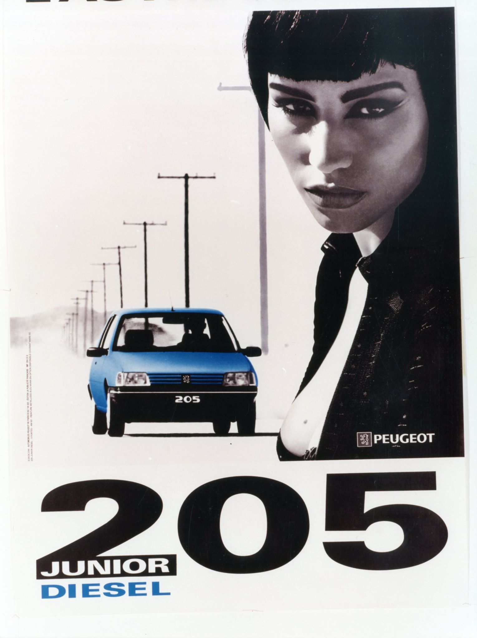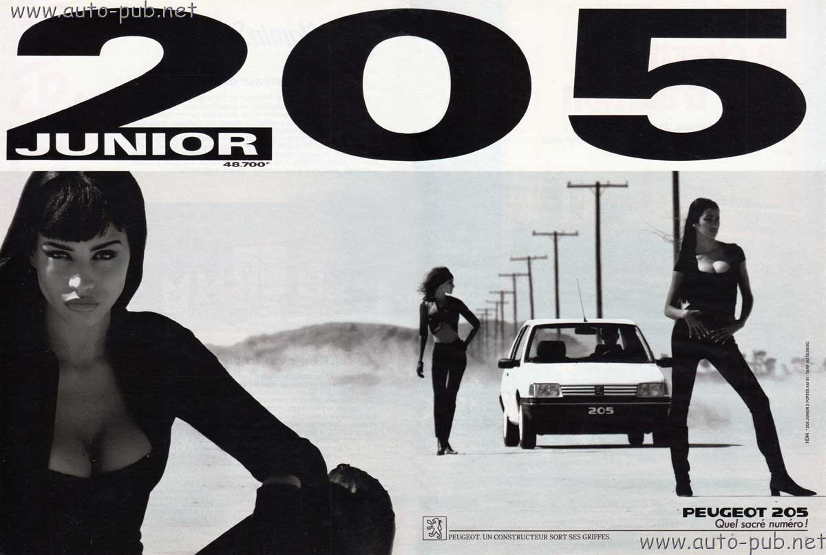 Au second semestre 1990, Peugeot dédie à la 205 Junior un troisième film publicitaire particulièrement esthétique, réalisé par Jean-Bapiste Mondino et filmé comme à son habitude en noir et blanc. Point ici de James Bond en GTI aux sports d’hiver, l’anti-héros à l’air plutôt simplet et se balade en Junior sur une interminable route désertique. Il stoppe soudain la 205 devant une bande de trois auto-stoppeuses en cuir tout droit sorties du mythiques film « Faster, Pussycat ! Kill ! Kill ! ». Sans un bruit, le trio prend lascivement place à bord de la voiture. L’une des filles lance au conducteur : « à toi de jouer maintenant ! » alors qu’un gang de motards grossit dangereusement dans le rétroviseur. La 205 démarre alors sur les chapeaux de roue pour l’annonce de fin. Le film, décliné en affiches et en annonces presse, puis réutilisé au printemps 1992 pour la campagne de la Junior diésel, a fait date. Il a même été parodié par Les Nuls, lesquels en ont livré une fin « alternative » peu reluisante. Au volant de la « Pigeot 265 », Dominique Farrugia n’arrive pas à redémarrer et les bikers agressent sauvagement les passagères…