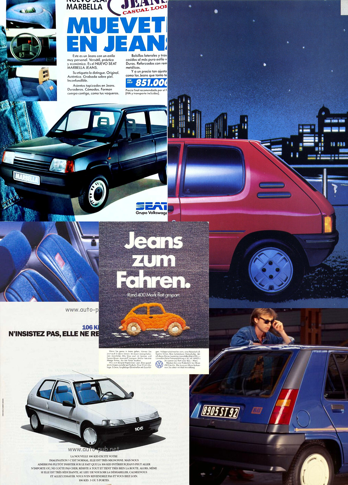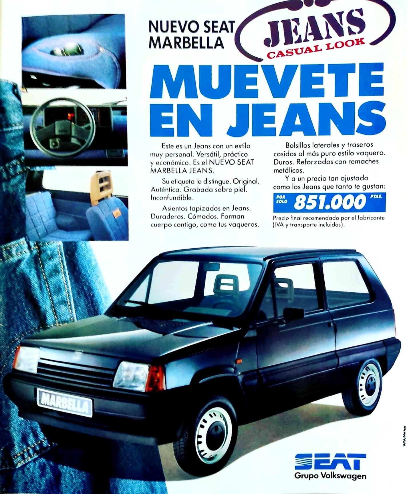 Courant 1991, Seat lance sur les marchés espagnols et allemands une Seat Marbella Jeans. Une seule couleur : un bleu denim avec des voiles de roues blancs. Le jean de la sellerie s’étend en façade de planche de bord jusqu’au hamac vide-poche hérité de la Fiat Panda. Comme un vrai jean, les sièges (avec appuis-tête) comportent des étiquettes en cuir fauve sur leurs dossiers et des poches latérales à rivets. Motorisée par un modeste moteur 850 cm³, cette Panda ibérique est au moins correctement protégée par de larges protections latérales, pour l’heure interdites aux voitures blue jean françaises. En dépit du rachat de Seat par Volkswagen, la Marbella doit encore tout à Fiat, ce qui n’empêche pas la publicité allemande d’évoquer très sérieusement « des standards de qualité VW ».