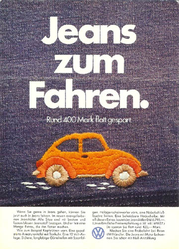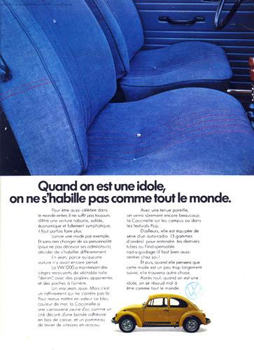 Renault n’est cependant pas allé jusqu’à habiller les sièges tubulaires de sa R4 de la même matière que le Levi’s 501. Citroën a par contre proposé un Tep « jean’s », un simili imitant le denim pour la 2CV6 Spécial, mais dans les années 1980 seulement. C’est en réalité à Volkswagen que revient la primeur de l’idée, toute simple, mais géniale, de la voiture blue jean. C’est le principe de la série limitée « Jeans » proposée à la rentrée 1973 sur la base de la 1200, la plus lente et la moins chère des Coccinelle (à relire dans Youngtimers n°133). Avec elle, VW visait la jeunesse. Cela peut paraître paradoxal pour un modèle aussi ancien, désuet voire peu sûr sur le mouillé, mais en 1973 la crise pétrolière et la fin de la croissance à deux chiffres a relégitimé les voitures « essentielles » économiques à l’achat. « Dans le contexte économique actuel, il est indéniable que les Coccinelles, et en particulier les 1200, ont un avenir devant elle » affirme sans férir la documentation adressée à la force de vente. On s’est gardé bien sûr de préciser que la Golf, qui va marquer chez VW un bon technologique de quarante ans en avant, est quasiment prête…