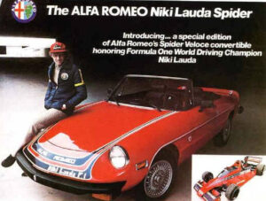 En 1976, Alfa Romeo effectue son grand retour en Formule 1 en tant que motoriste. La firme italienne s’associe à l’écurie Brabbham dirigée à l’époque par Bernie Ecclestone, à laquelle elle fournit le boxer à 12-cylindres de 3 litres dessiné par Carlo Chiti. Fin 1977, le double champion du monde Niki Lauda claque la porte de Ferrari et rejoint Brabbham. Cela ne lui réussira guère car il ne va remporter que deux victoires durant une saison 78 dominée par Mario Andretti et les révolutionnaires Lotus 79 à l’inoubliable livrée John Player Special. Dans l’immédiat, l’importateur américain d’Alfa Romeo se saisit de l’opportunité commerciale en lançant une série limitée « Niki Lauda F1 » sur la base du Spider Veloce. Lauda pose avec la voiture qui porte son nom pour le feuillet publicitaire et roule sur le circuit du Grand Prix de Long Beach au volant du premier exemplaire d’une série de 350.